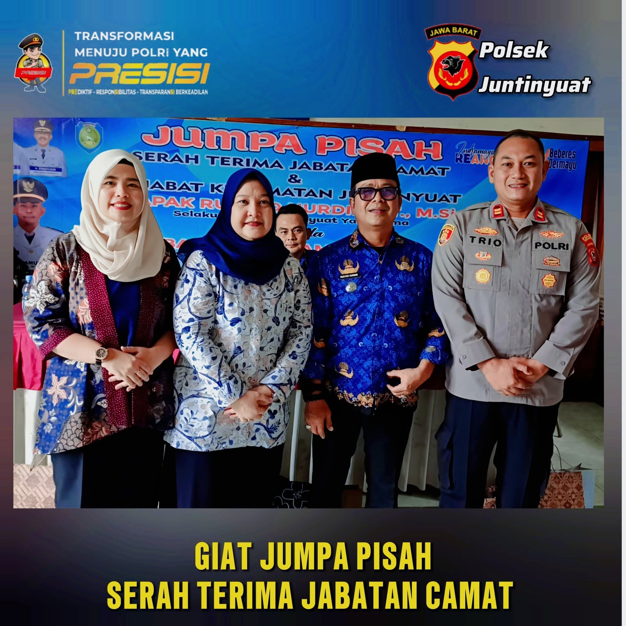 “Pisah sambut ini bukan sekadar seremonial, tetapi momentum memperkuat sinergi antara pemerintah, TNI, Polri, dan masyarakat. Kami siap mendukung camat baru demi terciptanya pelayanan yang optimal serta situasi kamtibmas yang aman dan kondusif di wilayah Juntinyuat,” ujarnya.