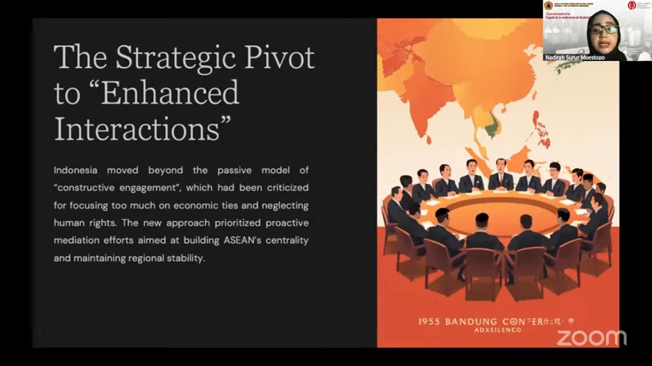“Prinsip-prinsip Bandung menjadi fondasi penting bagi kerja sama internasional yang lebih adil dan inklusif. Di tengah krisis global dan dinamika geopolitik yang kompleks, nilai-nilai ini perlu terus diperjuangkan, termasuk dalam konteks Asia Tenggara,” ujar Nadirah.