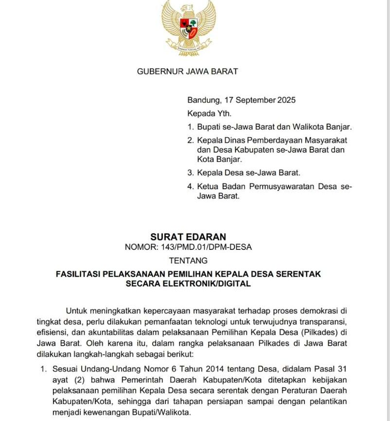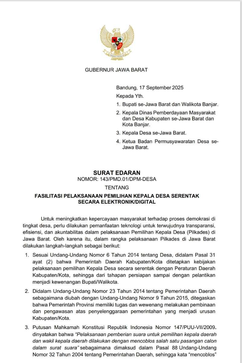 Seperti yang dirilis jabarprov.go.id, gubernur Dedi Mulyadi telah mengeluarkan SE Nomor 143/PMD.01/DPM-Desa tentang Fasilitasi Pemilihan Kepala Desa Serentak secara Elektronik/Digital.
