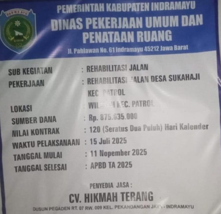 Ia menjelaskan, papan nama proyek yang di pasang di ruang publik bahwa, rehabilitasi inprastruktur jalan di Desa Sukahaji Kecamatan Patrol Kabupaten Indramayu, di laksanakan oleh CV. Hikmah. Peningkatan jalan dengan sistem Cor beton dengan sumber dana dari APBD tahun anggaran 2025 sebesar Rp875.635.000,- dengan batas waktu pelaksanaan selama 120 hari kalender, 15 Juli-11 Nopember 2025, ucap Udin, nama panggilan sehari- hari nya.