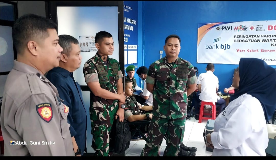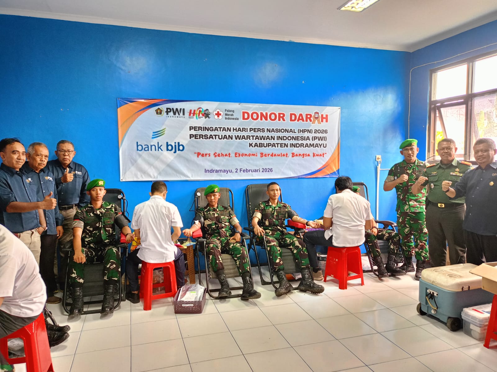 PWI Kabupaten Indramayu kerja sama bareng Brigif 34 TP / Cakra Buana, Kodim 0616 Indramayu, Polres Indramayu, jajaran ASN, Palang Merah Indonesia (PMI) Cabang Kabupaten Indramayu dan grup goes sepeda ontel Junti menggelar bakti sosial berupa donor darah di Sekretariat PWI Indramayu, Senin (2/2/2026).